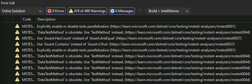 I recently upgraded my application MSTests to the newer Microsoft.Testing.Platform. This migration was done a few weeks back. But it left behind hundreds of analyzer warnings imploring me to adopt the new MSTest conventions.